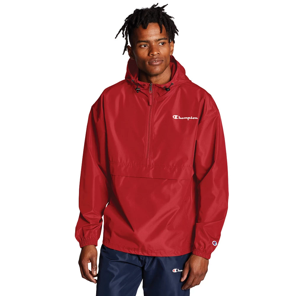 Men’s Champion® Packable Jacket :: Go from fair to stormy weather with a Jacket that packs into its own pocket. Lightweight polyester micro poplin fabric with water resistant coating. Three-piece scuba hood with adjustable shock cords. Half zip front for easy on and off. Low-profile front kanga pocket. Straight bottom hem with shock cords and elastic cuffs to shield you from the elements. Jacket packs into a hidden front zip pocket for convenient, easy storage. Champion® logo screen-print left chest. C patch logo on cuff.