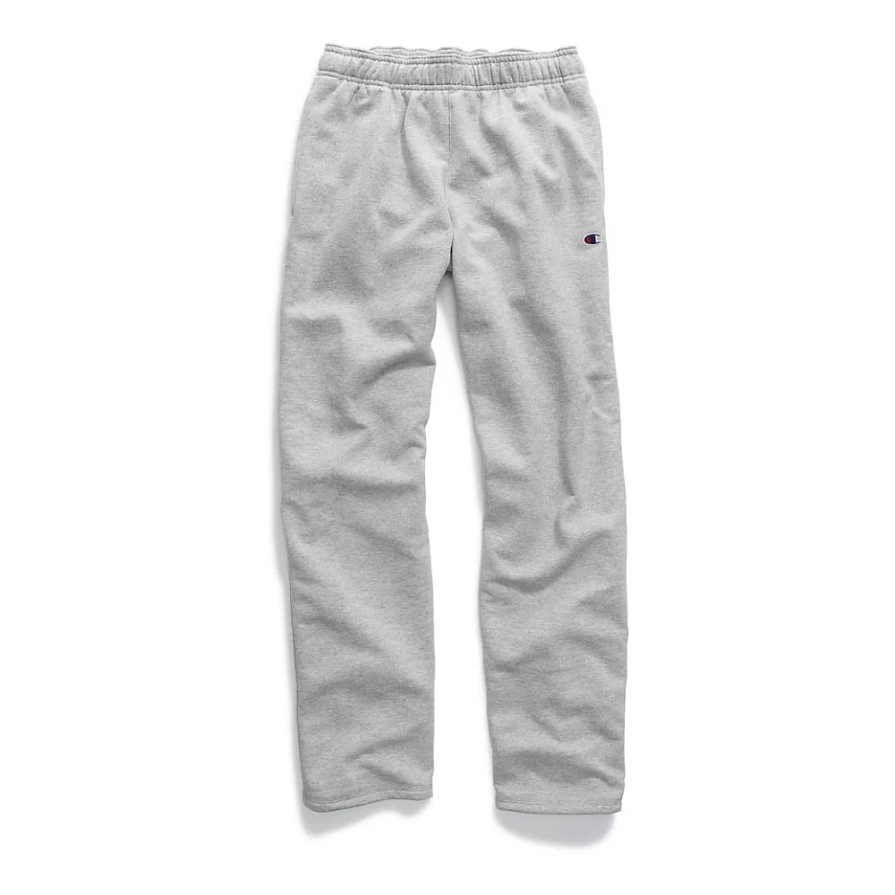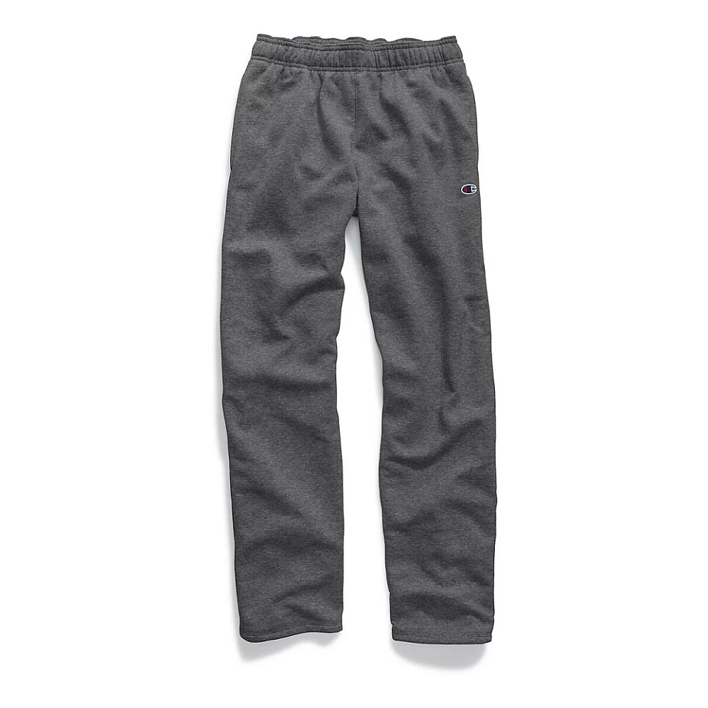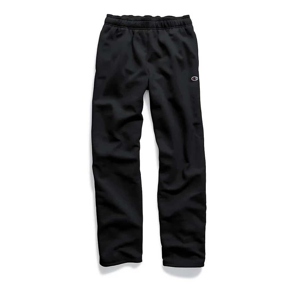 Men’s Champion® Powerblend Fleece Open Bottom Pant :: You’ll wear our Powerblend; Fleece Open Bottom Pants for their comfort alone but the great fit is what you’ll love. Feels plush and soft without adding extra bulk. Cotton/polyester blend for reduced pilling and shrinkage. Brushed inside for exceptional softness. Relaxed fit with open bottom leg. Bartacked on seam pockets. Triple stitching reinforces seams for durability. Elastic waist with inner draw cord adjusts the fit. A percentage of recycled fibers are used in making the fabric. Embroidered C logo on hip.