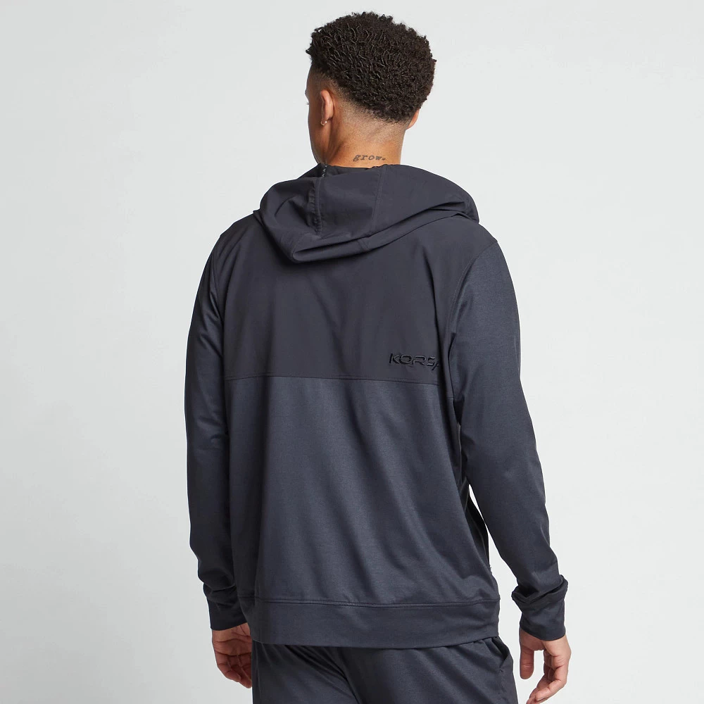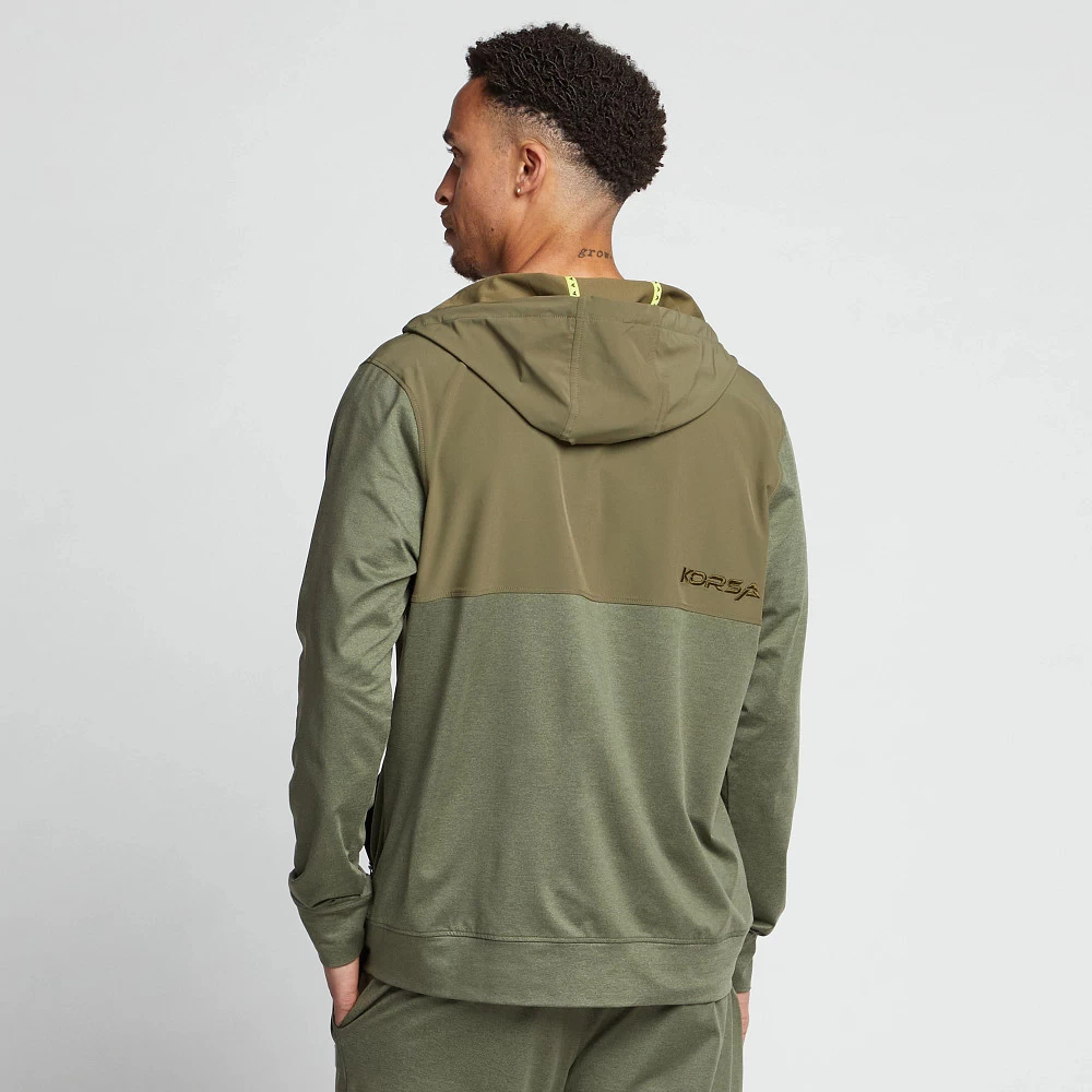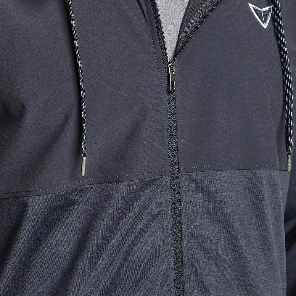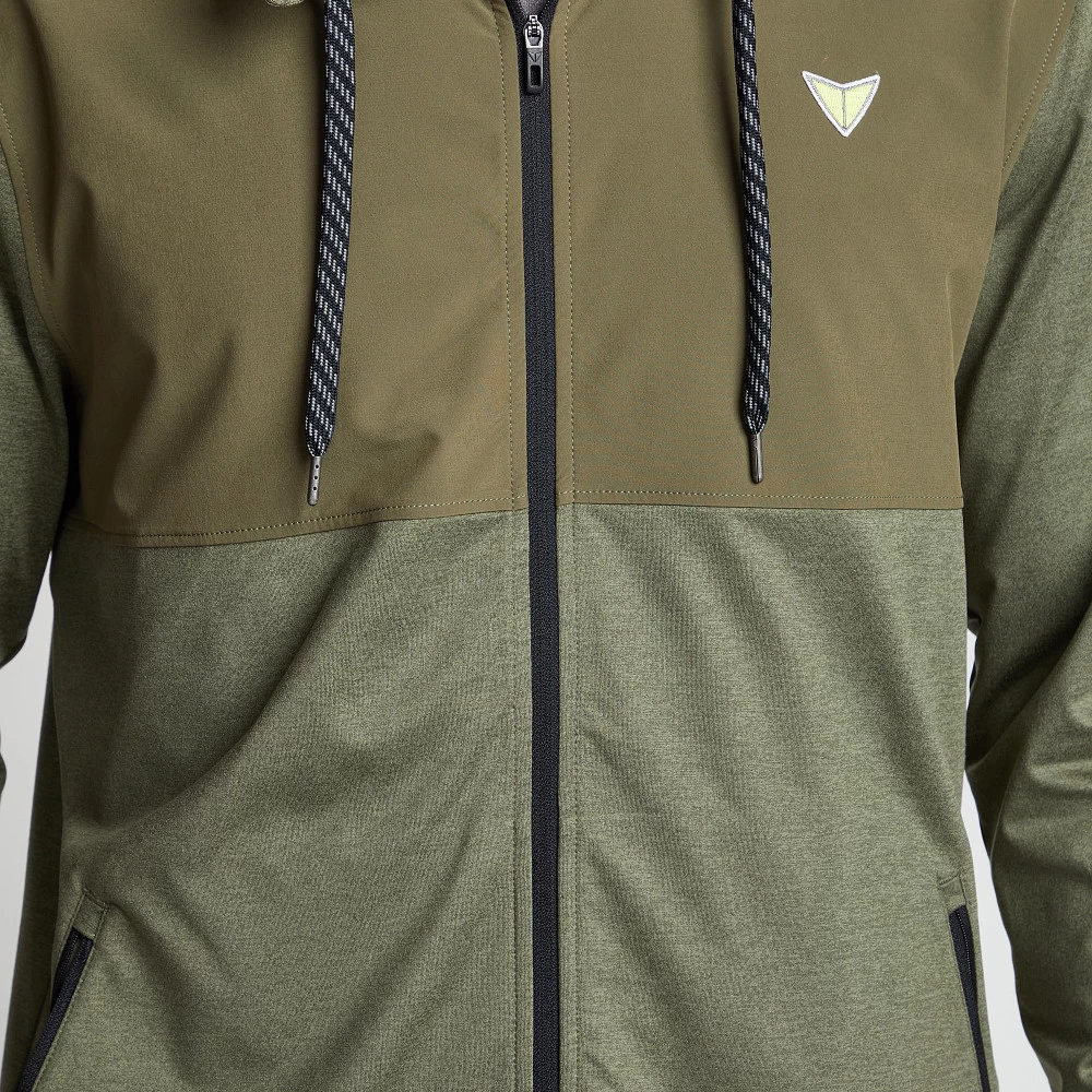 Men’s Korsa Transfer Full Zip Hoodie :: Lightweight, stretchable and perfect for those in between seasons when the weather just doesn’t know what to do. Your Transfer Full Zip Hoodie will quickly warm you up with a stretch woven hood and contrast grid fleece at upper front body. Built-in venting assures you never overheat either. Adventure on thanks to flatlock seams that reduce any chance of chafing.