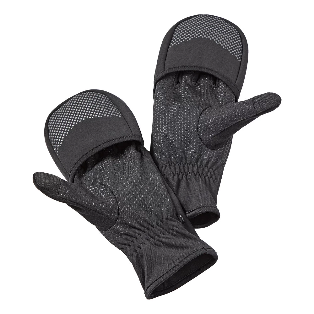 R-GEAR® CONVERTIBLE WEATHER RESISTANT GLOVES :: R-Gear Convertible Weather Resistant Gloves give you the best of both worlds. Made for windy and rainy running, this glove/mitten combo provides warmth and flexibility with natural 4-way stretch. Extra grip on your palm and fingertips make it easy for you to use your phone to find the right song to get you in the zone. Reflective elements make these gloves perfect for early mornings and late nights.