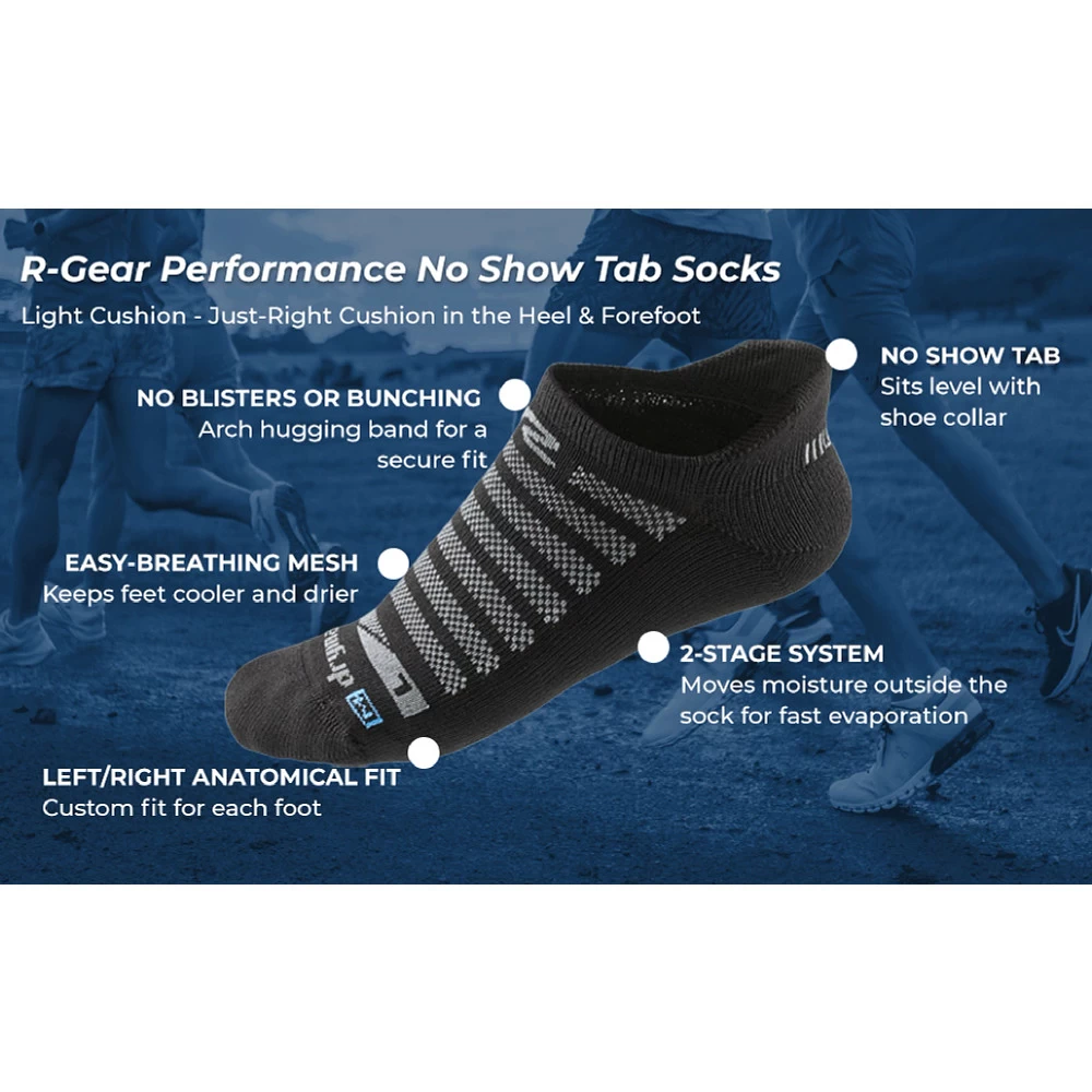 R-Gear Drymax® Light Cushion No Show Tab 3 Pack :: Step up your running and training from the ground up with R-Gear Drymax Light Cushion No Show socks. Just the right amount of comfy cushion topped off with a dialed-in fit all while keeping your feet 25 times dryer than other socks. These hardworking socks are your best defense against blisters, hot spots, bunching and stinking and are so durable they’ll last over 1,000 miles! All the protection you want with the no-show style you love.