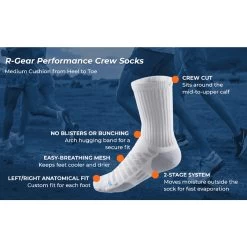 R-Gear Drymax® Medium Cushion Crew 3 Pack :: Take your running sock comfort to the next level with our R-Gear Drymax Medium Cushion Crew 3 Pack Socks. Get max comfort and performance with our most cushioned running socks designed with a perfect fit-hugging fit. These socks are your best defense against sweat, stink and blisters thanks to the 2-stage moisture removal system. Mid-calf crew length protects your legs from sweat and debris on and off-road.