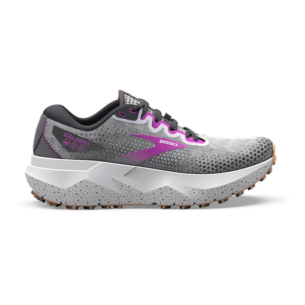 Women’s BROOKS® CALDERA 6 :: Prioritizing protection, comfort, and breathability, your updated Women’s Brooks Caldera 6 just became your new favorite trail running shoe. You’ll handle unstable terrain with confidence thanks to a lace keeper on the top of the foot and integrated internal saddle to cradle your midfoot and keep you secure. High surface area 4mm lugs built into a wide base work together with a full-length TrailTack outsole and TPU toe guard for rugged traction and shielding in the elements. Refreshed with more breathable materials, the Caldera 6 is a top performer whether it’s a quick loop or a longer venture.