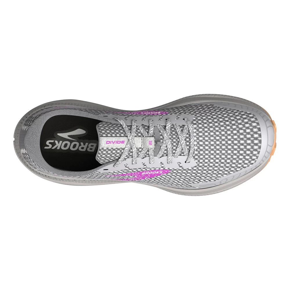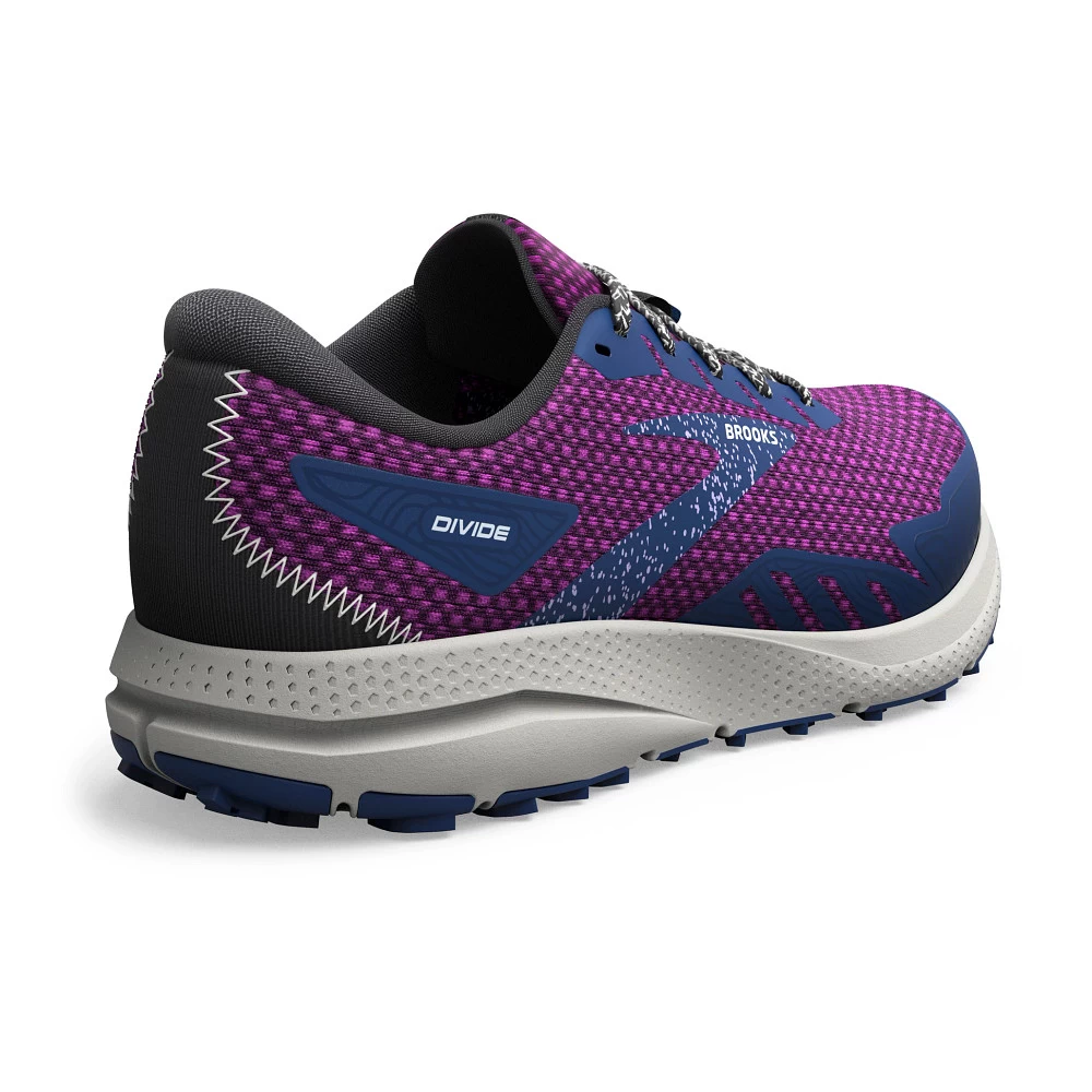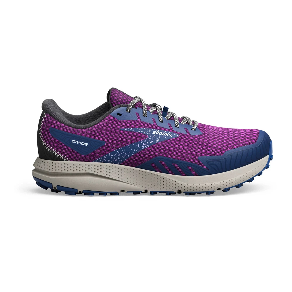 Womens’:s BROOKS® DIVIDE 4 :: Fly over rocks and roots with ease in your updated Women’s Brooks Divide 4 trail runner. The brand new TrailTack rubber outsole provides optimal traction on every surface whether it’s puddled or bone dry, while the airy mesh upper and TPU mudguard offer superior fit. Enjoy super-soft cushioning thanks to DNA LOFT for unbeatable shock absorption and energy return, as well as high surface area lugs for tenacious grip! Plus, you’ll love that your Divide 4 has drainage slits in the side, a trusty toe cap, and is made from the equivalent of 7 recycled water bottles!