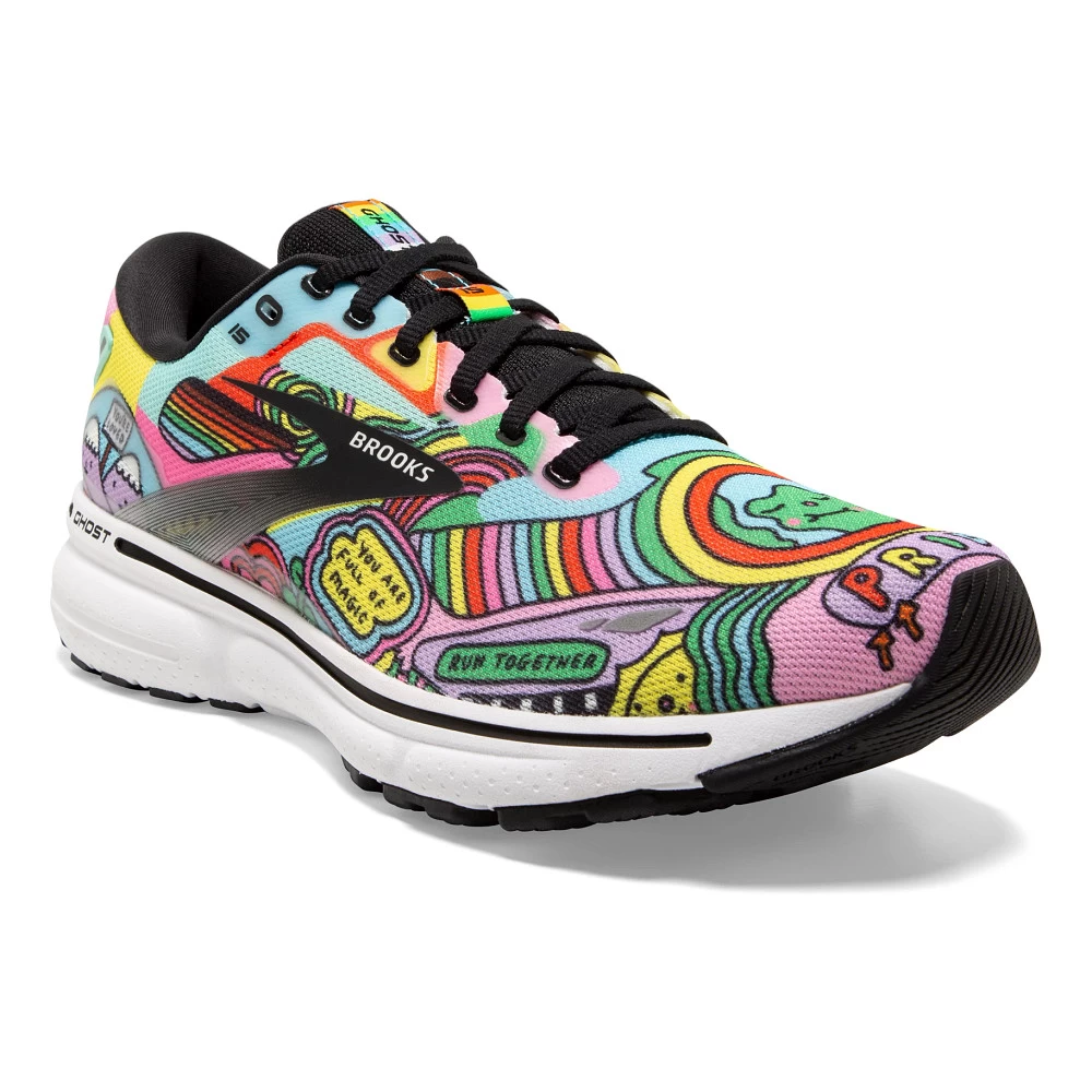 Women’ BROOKS® GHOST 15 RUN PROUD :: Run with pride in your special edition Women’s Brooks Ghost 15 Run Proud shoes. Colorful illustrations and artwork honor the queer community, plus custom Pride sockliners and tongue labels make clear this shoe shows solidarity with the LGBTQ+ community while you stay active. A new midsole features plush DNA Loft v2 cushioning and the overall shoe weighs 8.8 ounces: even less than the Ghost 14! An engineered air mesh upper is 3D printed to ensure perfection and breathability. Start building up your mileage because your Ghost 15 has High Performance Rubber in the heel for extra durable road protection.