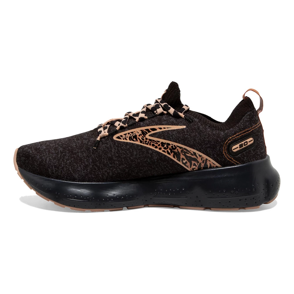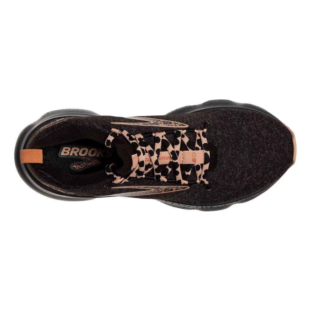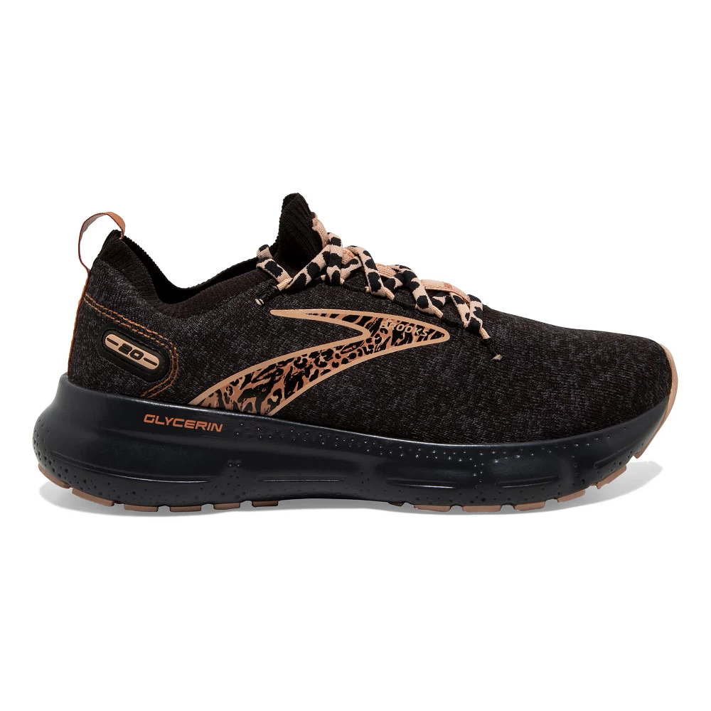Women’s BROOKS® GLYCERIN STEALTHFIT 20 RUN WILD :: Sneak up on your competition wearing your special edition Women’s Brooks Glycerin Stealthfit 20 Run Wild. Black as night with bold big-cat prints on the lacing and logo adds a little roar to every step. New nitrogen-infused DNA LOFT v3 is terrifically innovative and ensures a softly-cushioned but bouncy landing. Coupled with a refreshed midsole and outsole that’s wider than its predecessors, transitions are smooth and painless. On race day, the feather-weight technology and adaptable fit of your Stealthfit 20 Run Wild takes all of your hard work and turns it into effortless performance.