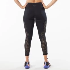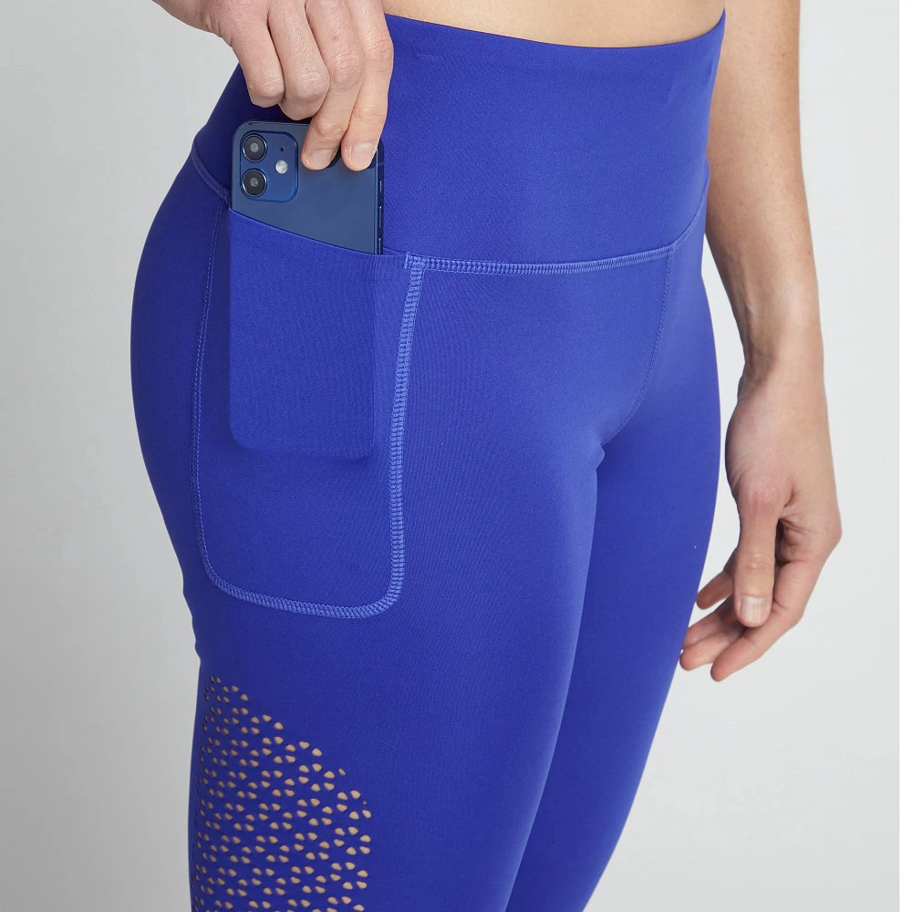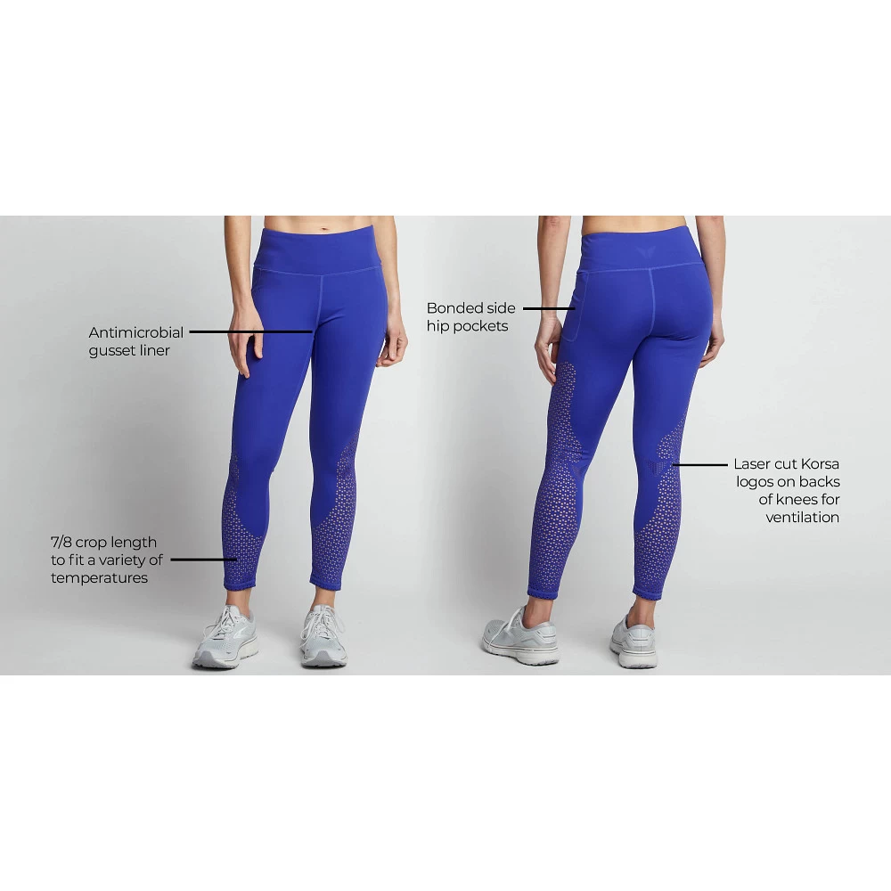 Women’s Korsa Ventilate 7/8 Tight :: Ultra ventilated slightly cropped run tights that effortlessly handle warmer weather and your sweatiest workouts. Laser cut perforations down the outside of the legs and backs of knees allow maximum airflow to keep you cool and bonded side pockets provide plenty of bounce-free storage.