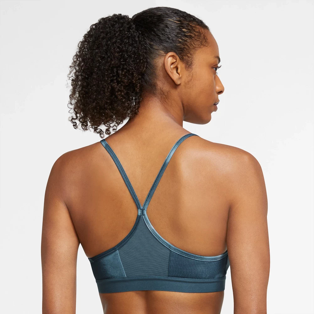 Women’s Nike® Dri-FIT Indy Dye Print Bra :: Your new favorite strappy outfit essential. The Women’s Nike Dri-FIT Indy Dye Print Bra supports your hardest workouts with sweat wicking tech and mesh in both the front and the back for ideal air flow. Easily adjustable straps help you find the perfect shape and support. Made with at least 50% recycled polyester, this bra perfectly hugs your body and the environment.