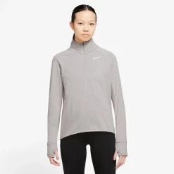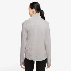 Women’s Nike® Therma-FIT Element 1/2 Zip :: They really did think of everything! Nike’s Women’s Therma-FIT Element 1/2 Zip combines heat-managing fabric with Swoosh-shaped nodes to help keep warmth in during those cold weather activities. Built-in mittens with thumbholes protect your digits from the elements, while a side pocket is large enough to hold your device. Wear it on its own or as a layering piece.